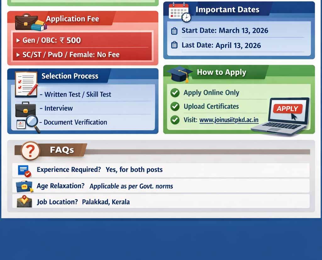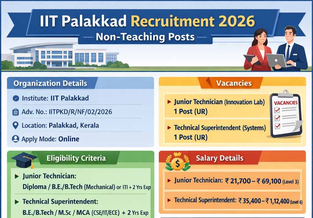 భారతదేశంలో ప్రముఖ టెక్నికల్ సంస్థలలో ఒకటైన IIT Palakkad (IIT Non-Teaching Recruitment 2026) నుండి విడుదలైన ఈ నోటిఫికేషన్ ద్వారా Group B & Group C నాన్-టీచింగ్ పోస్టులు భర్తీ చేయబడుతున్నాయి. మంచి పే స్కేల్, కేంద్ర ప్రభుత్వ ఉద్యోగ భద్రత, మరియు కెరీర్ గ్రోత్ కలిగిన ఈ అవకాశాన్ని తప్పకుండా వినియోగించుకోవాలి.