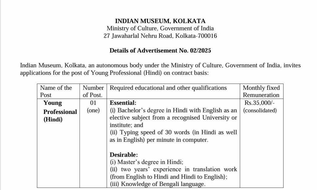 ఇక్కడ ఇండియన్ మ్యూజియం, కోల్కతా నుండి విడుదలైన (Indian Museum Recruitment 2025) యంగ్ ప్రొఫెషనల్ (హిందీ) ఉద్యోగ నోటిఫికేషన్కు సంబంధించిన పూర్తి వివరాలు మరియు టేబుల్ రూపంలో సమాచారం ఇవ్వబడింది: