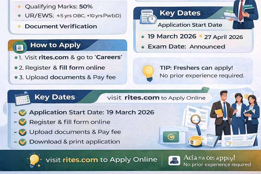 RITES వంటి Central PSU లో ఉద్యోగం పొందడం చాలా మంచి అవకాశం. ముఖ్యంగా Freshers కి ఇది Golden Chance. సరైన ప్రిపరేషన్ చేస్తే ఈ ఉద్యోగాన్ని సాధించడం సులభం. వెంటనే అప్లై చేసి మీ కెరీర్‌ను ముందుకు తీసుకెళ్లండి.